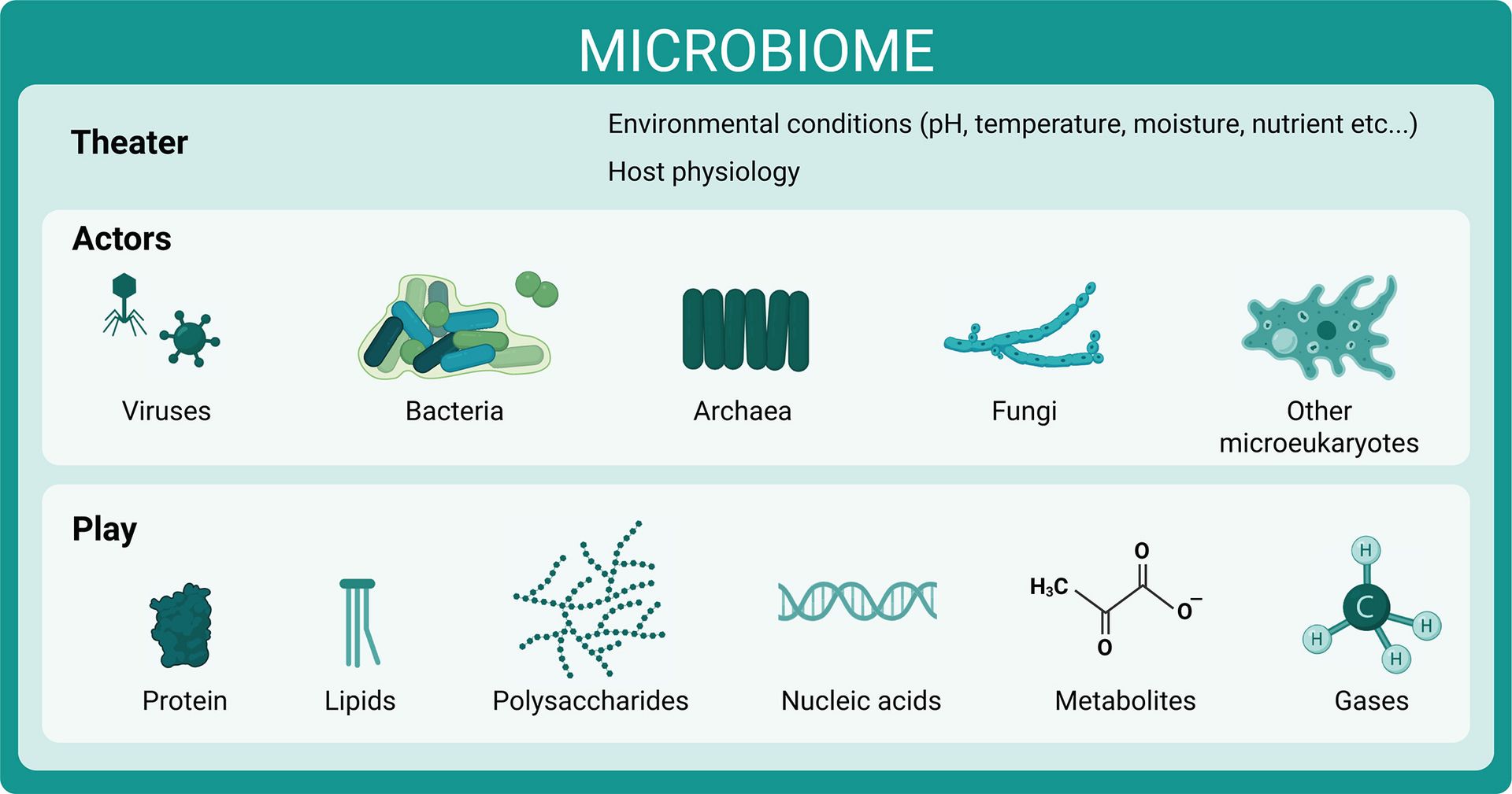 Working definition of a microbiome. Using an extended metaphor, a microbiome can be described as a theater where microorganisms and viruses (actors) perform a play.
