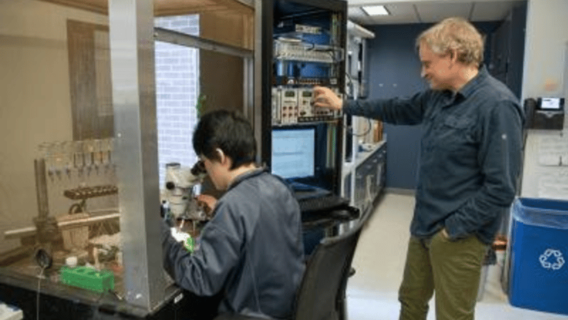 Zhaoyang Jiang, Biology Ph.D. candidate, records ion channel activity in a living cell with Timothy Jegla, associate professor of biology.